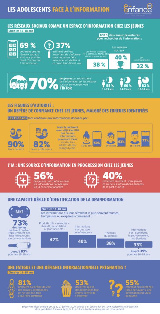 Enquête réalisée en ligne du 22 au 27 janvier 2026. Échantillon de 1 049 adolescents représentatif de la population française âgée de 11 à 18 ans. Méthode des quotas et redressement appliqués aux variables suivantes : sexe, âge, catégorie socioprofessionnelle des parents, région et taille d’agglomération de l’interviewé(e).