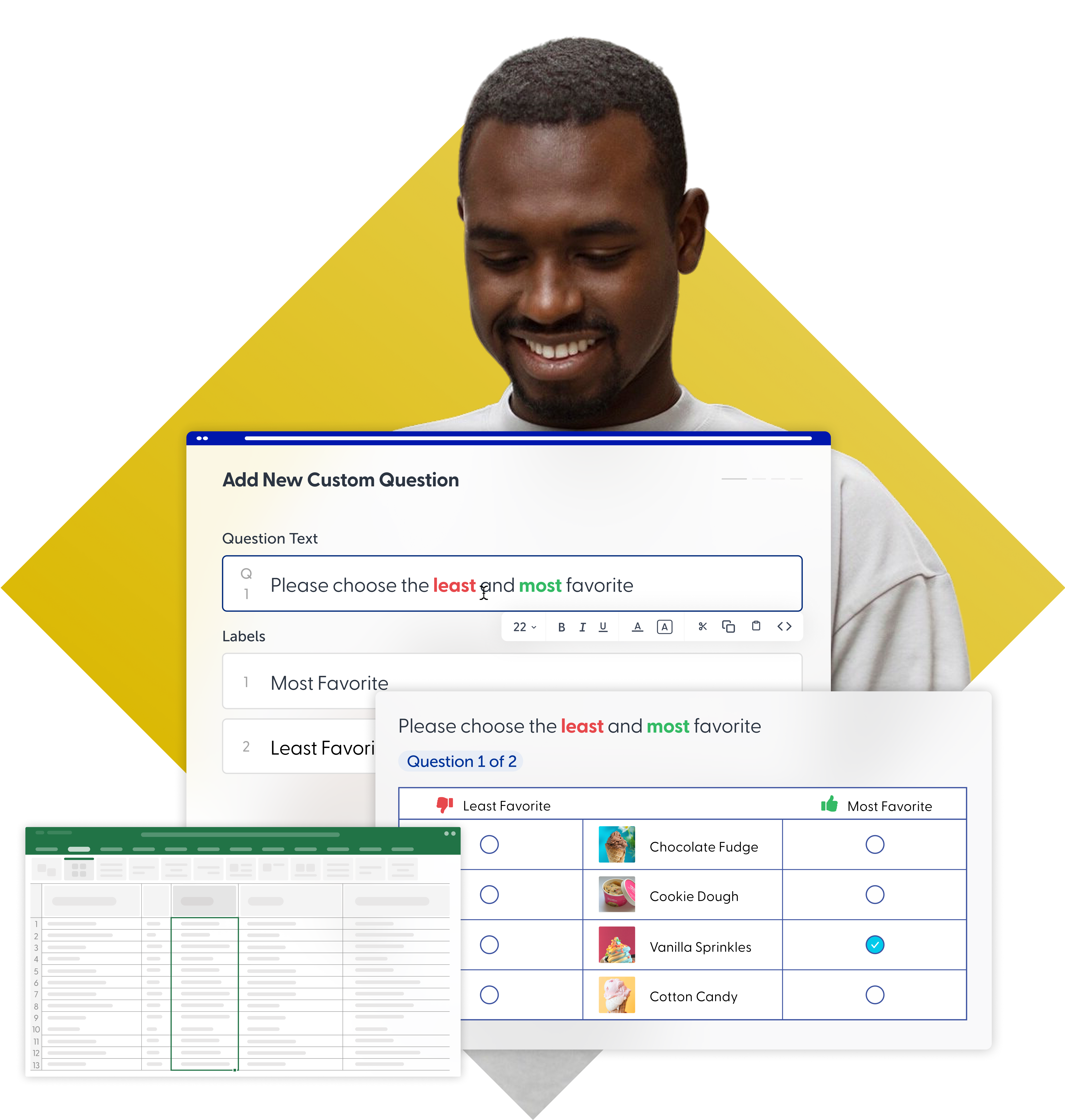Il design è automatico, ma puoi adattare il MaxDiff alle tue esigenze. Puoi aggiungere domande prima o dopo il modulo MaxDiff.