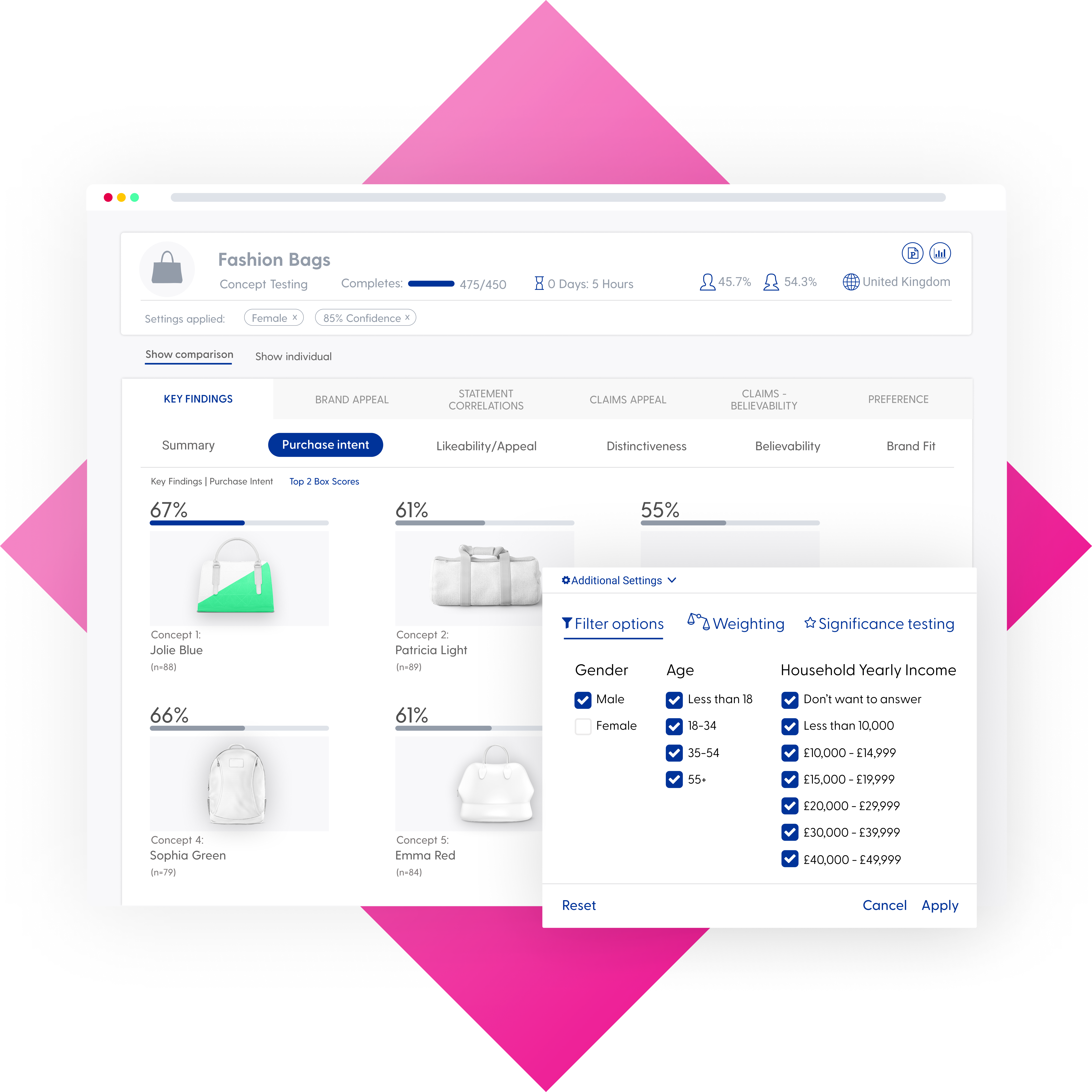 Our concept testing solution is truly end-to-end, highly flexible to meet your specific needs, and automated for easy setup and launch.